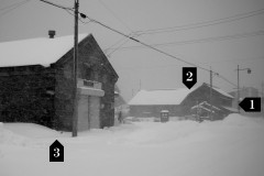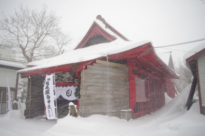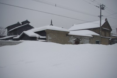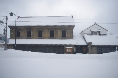 | 駅前通りには往時の繁栄をしのばせる数々の歴史建築が残っています。その筆頭が重要文化財の旧本間家住宅。屋号をつけて「丸一本間家」とも呼ばれます。建造は1891(明治24)年。はじめ呉服商を営み、その後はニシン漁の網元になりました。木骨石造の主屋を中心に、石蔵や土蔵が残っています。 | ![]() 石造の店舗と土蔵を並べた旧本間家住宅 |