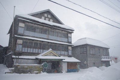 | 増毛駅前には3階建ての旅館建築、富田屋があります。建造は1933(昭和8)年。いまは営業していませんが、駅前旅館としての風情は全国屈指だと思います。その隣にある下見板張りの風待食堂もいい味を出していました。 | ![]() 戦前の3階建て旅館建築、富田屋 |