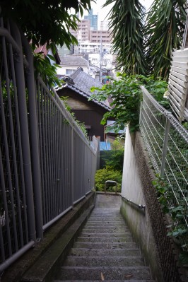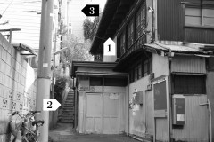 その町並みは一見すると下町そのもの。しかしよく見ると“山の手らしさ”も潜んでいます。たとえば、路地裏の勝手口に置かれた沓脱石(くつぬぎいし)は、下町ではあまりお目にかかれません。瓶ケースを無造作にひっくり返して使うのが下町流ですが、さすがは山の手、お上品ですね。 |