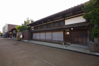 物資集散の拠点として多くの廻船問屋が居を構えた東岩瀬では、メインストリートに沿って、いまも商家がたくさん残ります。その多くが道の西側、つまり神通川岸に軒を連ねています。 |