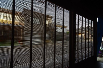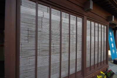 東岩瀬の町並みの特徴がスムシコ。出格子に竹すだれをはめた構造で、プライバシーの保護に役立つ建具です。竹すだれは、幅7〜8ミリ程度に割った竹を、3〜4ミリ間隔で水平に並べてつくられました。 |