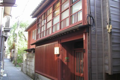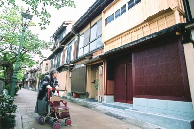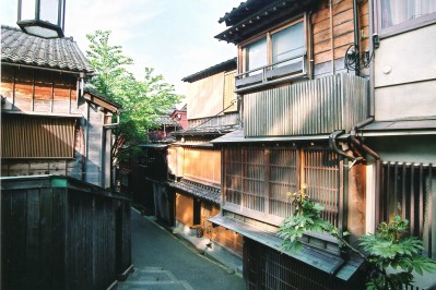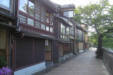 浅野川のほとりの主計町は、ひがし、にしと並ぶ金沢の三大花街のひとつ。川端の桜並木とともに、木造の茶屋建築が古都の風情を演出します。 |